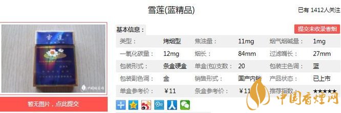 在精選云南優質煙葉和津巴布韋進口煙葉的基礎上,輔以名貴香精,由世界級調香大師精心調制而成。煙香濃馥豐滿高雅猶如行空流水、連綿不斷,吸味醇厚舒適如食人間美味、回味無窮。經香煙網小編市場調查雪蓮藍精品售價為11元/包。