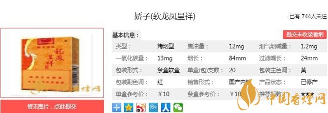 龍鳳呈祥經典產品,嬌子新裝貴氣登場,品質價格一脈相承。煙草本香透發,煙氣細膩柔和,口感純凈舒適,回味綿長津甜,更特有紅茶香韻,淡雅怡然。經香煙網小編市場調查嬌子軟龍鳳呈祥售價為10元/包。
