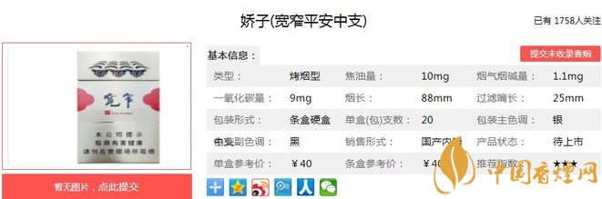 嬌子(寬窄平安中支)煙支長88mm,過濾嘴長25mm,過濾嘴紙張的色澤與煙盒相一致,同為灰色系列。以建筑符號為背景的紙張之上,寬窄與福字,對稱呼應。下面我們一起來看嬌子(寬窄平安中支)的參數信息:焦油量:10mg 煙堿量:1.1mg 一氧化碳量:9mg