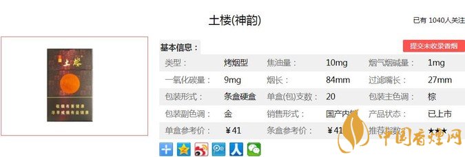 土樓神韻采用永定土樓生態有機煙葉為煙絲主料,凝聚客家文化之大成。氣質濃厚,底蘊深厚,以世界文化遺產之名及中國傳統藝術之品,象征客家熱情好客之禮,土樓團圓如意之情,地域特色明顯。經香煙網小編市場調查土樓神韻售價為41元/包。