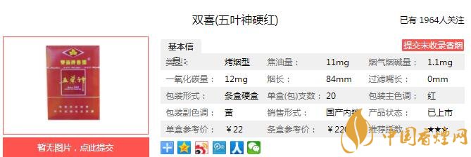 三、雙喜五葉神硬紅香煙參數