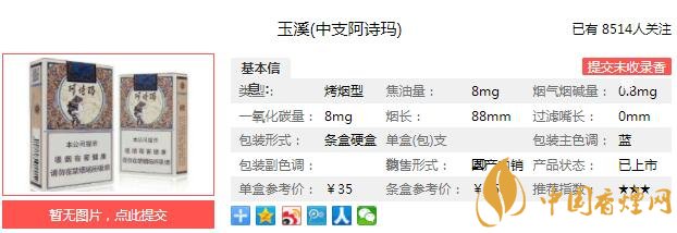 “玉溪(中支阿詩瑪)”是紅塔集團高端突破的基礎價位新品,以“純真年代”的理念和高顏值的形象回歸市場,選用小產區優質煙葉,添加枇杷植物顆粒,味道清香純正、清涼潤喉。經香煙網小編市場調查玉溪中支阿詩瑪售價為35元/包。