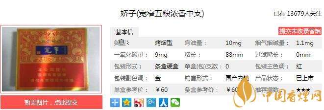 類型 :烤煙型 焦油量 :10mg 煙氣煙堿量 :1.1mg 一氧化碳量 :9mg