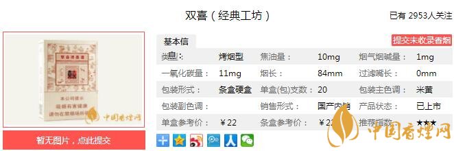 雙喜經典工坊突破了雙喜原有的設計風格,進行了大膽的創新,在雙喜家族中擁有相對獨特的外包裝,煙氣綿長、柔軟,減輕了刺激性,口感更加津甜、純凈、順喉舒暢、記憶度高。上市初期對年輕的消費者吸引力是比較強的。經香煙網小編市場調查雙喜經典工坊售價為22元/包。