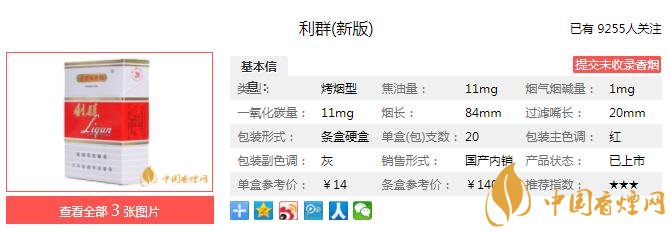 利群新版煙支長84mm,過濾嘴長20mm,利群新版有浙江版與全國版之分,浙江版的過濾嘴樣式,是傳統的雪花狀,而全國版則是呈光滑質感的肉色。下面我們一起來看利群新版的參數信息:焦油量:11mg 煙堿量:1.0mg 一氧化碳量:11mg