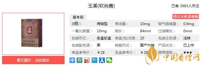 尚善玉溪秉承玉溪家族醇厚清香的經典本味,精選云煙之鄉優質煙葉,煙葉配伍豐富而協調,呈現溫潤醇香的細膩口感,軟包硬化的獨特包裝,完美保護每支尚善玉溪的卓越享受。經香煙網小編市場調查玉溪軟尚善售價為28元/包。