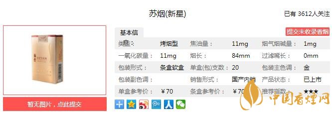 蘇煙(新星)和蘇煙(天星)是“蘇煙”全新推出的“星系列”的兩個原創型產品;這兩款“星系列”的主力規格共同承載“蘇煙”通過主銷價區向上延伸力爭實現提升品牌價值的戰略意義,并以此來鞏固和提升“蘇煙”在高端消費者心目中所具有的“高端身份”的價值認知。經香煙網小編市場調查蘇煙新星售價為70元/包。