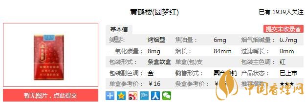 黃鶴樓軟圓夢紅煙支長84mm,過濾嘴長25mm,過濾嘴上有分子結構圖和黃鶴樓圖案。煙支感覺很不錯,看著很華麗,很有意義層次。下面我們一起來看黃鶴樓軟圓夢紅的參數信息:焦油量:6mg 煙堿量:0.7mg 一氧化碳量:8mg
