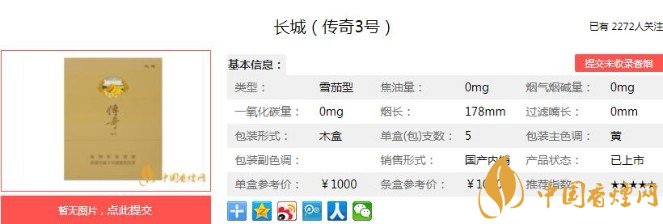 傳奇3號走的是精品路線,純手工制作,每根都是力求最好,抽起來的煙氣醇和,富有感覺。下面便是長城(傳奇3號)的基本參數:焦油量:中,木盒(每盒5支,每條1盒):長度 178mm,直徑 18.7mm,環徑 58.7mm.