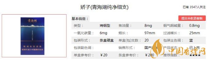 以上便是香煙網小編為大家介紹的關于嬌子青海湖純凈多少錢一包 青海湖純凈價格及圖片介紹的相關信息,看完之后大家是不是對于嬌子(青海湖純凈)這款香煙的相關信息更加了解呢。大家還想查詢更多的相關內容歡迎點擊:嬌子青海湖細支香煙多少錢一包 嬌子青海湖細支參數