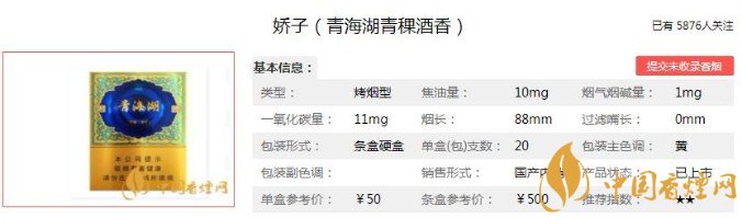 以上便是香煙網小編為大家介紹的關于青海湖青稞酒香多少錢一包 青海湖香煙價格及口感介紹的相關信息,看完之后大家是不是對于嬌子(青海湖青稞酒香)這款香煙的相關信息更加了解呢。大家還想查詢更多的相關內容歡迎點擊:嬌子青海湖細支香煙多少錢一包 嬌子青海湖細支參數