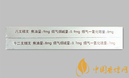 類型 :烤煙型 焦油量 :9mg 煙氣煙堿量 :0.9mg 一氧化碳量 :9mg