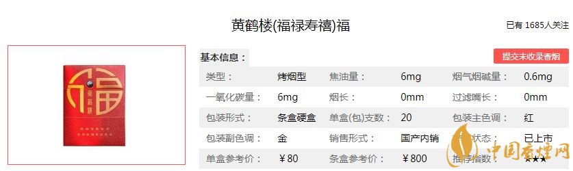 黃鶴樓福祿壽喜四款香煙均采用紅底色,金色字外觀設計,帶給人們喜慶,大氣,有檔次的品位。煙支規格都為84MM,每條10盒包裝,單價均為80元/包。