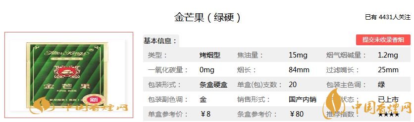 以上就是香煙網(wǎng)小編為大家整理介紹的關(guān)于金芒果綠硬多少錢一包?金芒果綠硬香煙價(jià)格和圖片的相關(guān)內(nèi)容。金芒果香煙曾經(jīng)風(fēng)靡全國,如今已慢慢淡出市場,實(shí)在是可惜啊。想了解更多下個(gè)月信息,請關(guān)注香煙網(wǎng)!