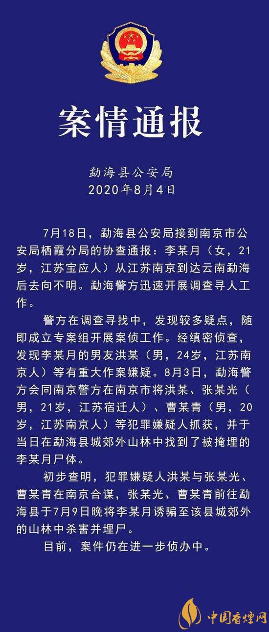 8月4日晚,西雙版納州勐海縣公安局發(fā)布通報,經(jīng)調(diào)查尋找,失聯(lián)25天的南京女大學(xué)生月月(化名),已于7月9日晚,被其男友洪某伙同張某光、曹某青,誘騙至勐海縣城郊山林殺害并埋尸。