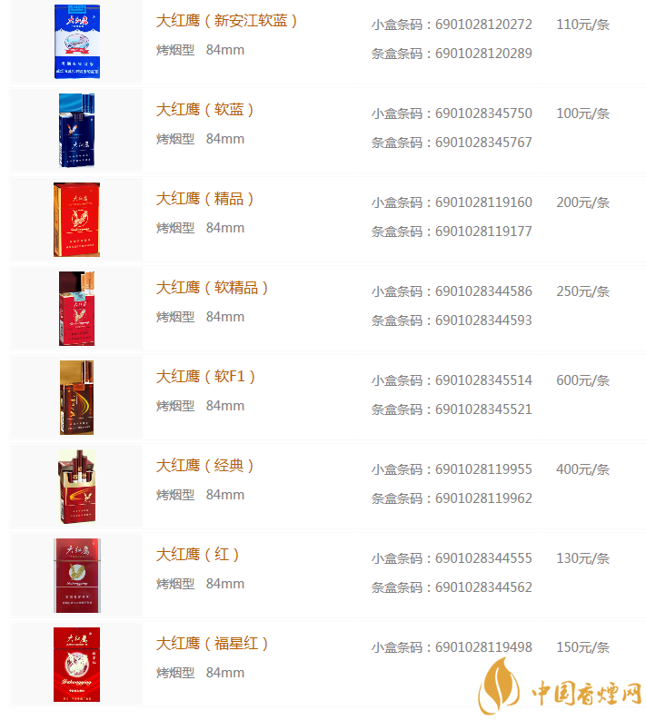 以上就是由香煙網小編為大家整理盤點的大紅鷹香煙價格表圖片的相內容,希望為大家提供幫助。相信通過上述內容的介紹,大家對大紅鷹香煙的價格有了了解。想查詢更多香煙價格,請關注我們!