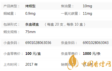 類型 :烤煙型 焦油量 :10mg 煙氣煙堿量 :0.9mg 一氧化碳量 :11mg