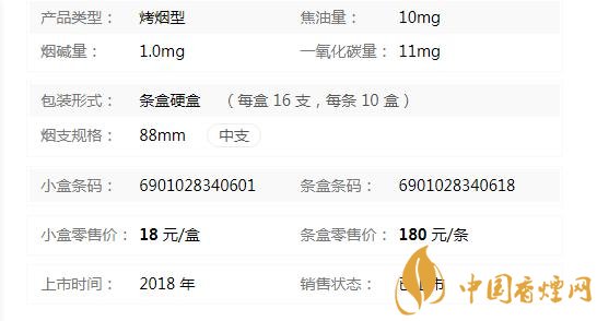 類型 :烤煙型 焦油量 :10mg 煙氣煙堿量 :1mg 一氧化碳量 :11mg
