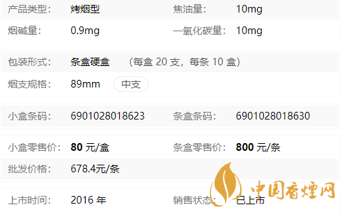 類型 :烤煙型 焦油量 :10mg 煙氣煙堿量 :0.9mg 一氧化碳量 :10mg