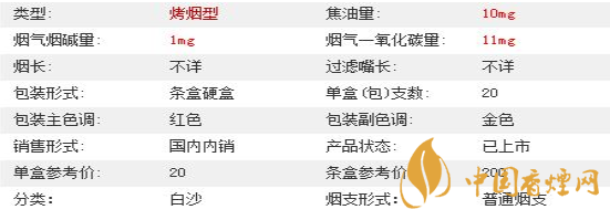 類型 :烤煙型 焦油量 :10mg 煙氣煙堿量 :0.9mg 一氧化碳量 :9mg