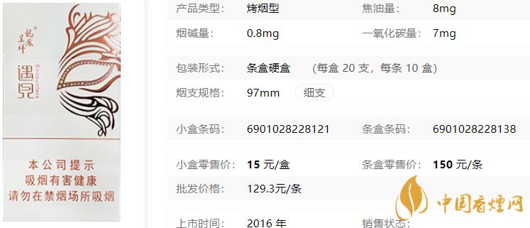 類型 :烤煙型 焦油量 :8mg 煙氣煙堿量 :0.8mg 一氧化碳量 :8mg