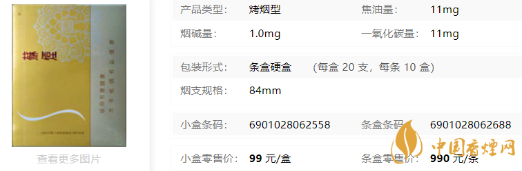 類型 :烤煙型 焦油量 :12mg 煙氣煙堿量 :1.1mg 一氧化碳量 :12mg