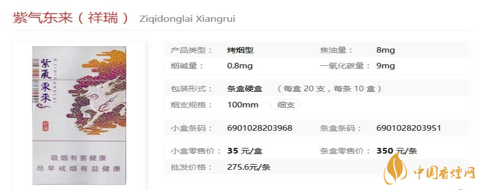 紫氣東來祥瑞煙支長100mm,過濾嘴長35mm,定位在細(xì)支煙品類。通過采用低溫保香,多級復(fù)配等特色工藝,使產(chǎn)品煙草本香更加突出,抽吸的均勻性更加穩(wěn)定,使消費(fèi)者在享受煙草香氣的同時,又能體味自然舒適的感覺。下面我們一起來看紫氣東來祥瑞的參數(shù)信息:焦油量:8mg煙堿量:0.8mg一氧化碳量:9mg。