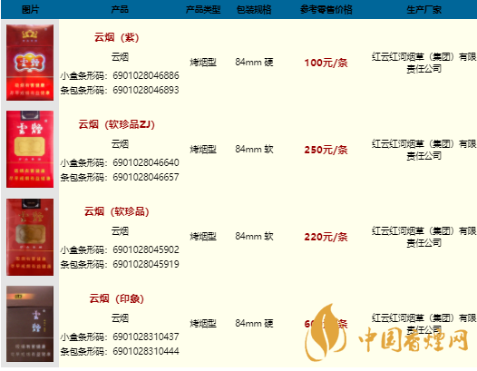 云煙香煙價(jià)格表圖大全一覽表2025價(jià)格
