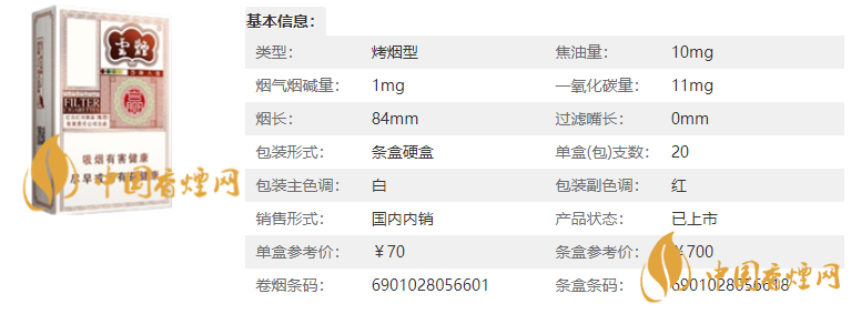 類型 :烤煙型 焦油量 :10mg 煙氣煙堿量 :1mg 一氧化碳量 :11mg