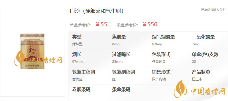 白沙硬細支和氣生財的價格為55元/盒,傳承了“和氣生財”常規卷煙產品的主體特征,經過的精細調整與優化,更加優雅、大方,傳達了“和氣生財”高貴的品質和產品與眾不同的“價值感”。由湖南中煙首席配方師調配,采用白沙特色工藝生產線制造,通過信息集成,把握技術發展方向,實行嚴格的過程控制管理,提高加工精度和產品質量控制精度,保證產品質量穩定。