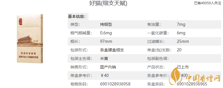 以上就是有關于好貓細支天賦香煙價格一覽的相關資訊,資料來源于網絡,由香煙網小編收集整理,如欲了解更多詳情信息,請關注香煙網,小編將會為大家帶來更多信息。