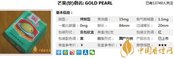 曾經有這樣一種香煙,綠色的煙盒上面畫著個盤子,盤子中央擺著一顆金光閃閃的芒果。這是河南產的一款香煙,這款香煙在幾十年前是轟動了全國的香煙,那么芒果香煙多少錢一包,現在就由香煙網小編為大家介紹一下芒果香煙價格表圖片。