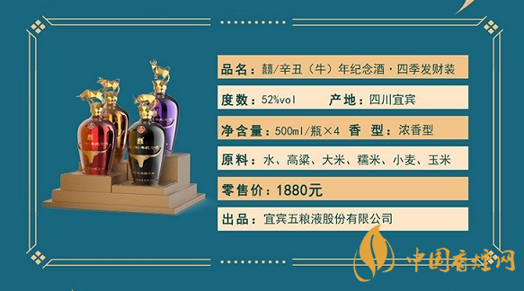 五糧液辛丑(牛)年紀念酒.四季發財裝,瓶蓋 頂立如牛,切割金屬牛以金屬材質潛心鑄造四種靈敏聚財的金牛形態!瓶身 金牛頭,采用浮雕工藝,將牛年傳統生肖結合,鴻運當頭照,宜賓五糧液有限公司:囍酒!瓶底 電鍍工藝質感,細致浮雕防滑!五糧液辛丑(牛)年紀念酒.四季發財裝京東售價1880元。