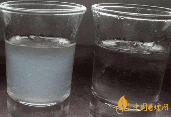 將酒倒入杯中,然后兌水,如果是純糧酒,則會出現失光、渾濁的現象,這是因為糧食酒中有些物質不溶于水,只溶于酒,加水后度數下降,水增多,這些物質就會析出,導致酒液渾濁;如果是酒精酒,則不會出現這種現象。