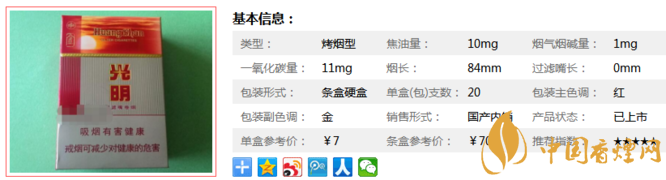 光明香煙是合肥的香煙品牌,“光明”卷煙是合肥卷煙廠60年代老品牌,當(dāng)時(shí)被譽(yù)為“大火把”,現(xiàn)已整合進(jìn)“黃山”品牌。是一款經(jīng)典又好抽的香煙,下面就由香煙網(wǎng)小編帶大家來了解一下光明香煙的相關(guān)參數(shù)信息。