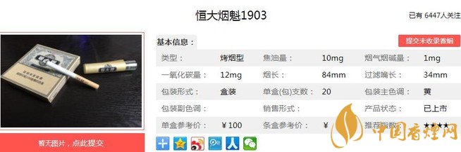 1948年,為慶祝中國恒大企業公司的成立,東亞煙草廠創立了“恒大”牌香煙,并委托天津華中印刷事務所的著名設計師陳嘉祥設計了“恒大”牌煙標。1956年,恒大煙草廠并入天津卷煙廠。“恒大牌”卷煙成為天津卷煙廠的主打產品。下面就由香煙網小編帶大家一起來了解恒大煙魁1903的相關信息。