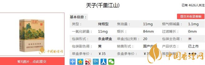 天子(千里江山)選用重慶武陵地區優質煙葉為原料,使用了四大減害技術,聞起來有一股淡淡的梅香。經香煙網小編市場調查天子(千里江山)售價為35元/包。