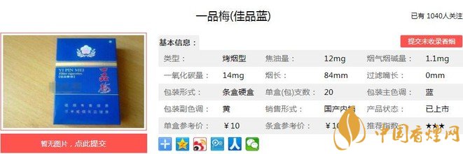 一品梅佳品藍香煙曾經是很多人心中的經典,香氣豐富飄逸,煙氣柔和,吸味醇和,余味純凈舒適,回味甜感。很多人稱它藍一品,在煙民心中的地位很不錯,但目前已經很難找到了。經香煙網小編市場調查一品梅佳品藍售價為10元/包。