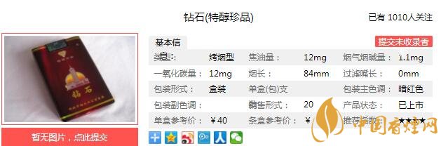 選用了以云南、貴州和福建等不同地區的上等煙葉作為主要原料,同時還輔以津巴布韋優質煙葉,生產中全部進行精心選葉。香料香精的選用國內高檔香料,輔以進口香料,著重突出該產品的高檔醇化煙香。煙香清雅、飽滿、余味干凈、舒適。經香煙網小編市場調查鉆石特醇珍品售價為40元/包。