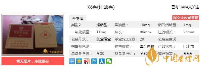 雙喜紅郵喜煙支長86mm,過濾嘴長25mm,雙喜紅郵喜以“無外香,更天然”為技術設計理念,綜合運用工藝生香最新技術,在進一步增強豐富煙香、提升協調性的同時,煙氣更加綿長、柔軟,賦予其氣質不凡的個性。下面我們一起來看 雙喜紅郵喜的參數信息:焦油量:10mg 煙堿量:1.0mg 一氧化碳量:11mg