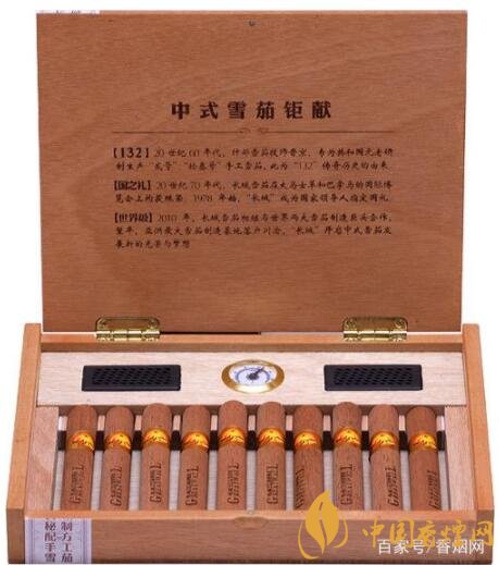 長城雪茄是中國歷史最悠久的一個品牌。長城(10支132秘制)是純手工的制作加上獨特工藝配方,全球首創的預開口雪茄,不需要剪去茄帽,原木色木盒十支裝,簡約、精致。每支都是全手工完成,盒中還有保濕器和溫度計。濕度恒定在68%左右。刻度盤下面有NORMAL字樣,示意60%-80%的濕度為正常范圍。這里的用心之處可見一斑。