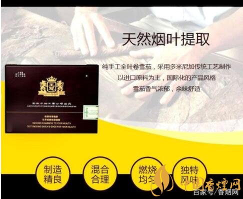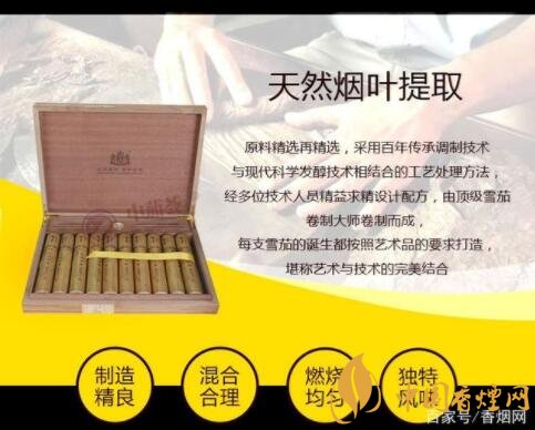 口感:全葉卷片煙純手工雪茄;香氣純正、豐滿,吸味順爽。微微的辛辣感,以煙葉原味為主線,融合交錯,勁頭適中,味道均衡。不沖不淡,十分適合初嘗雪茄的雪茄客。
