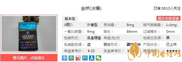 金橋冰爆煙支長84mm,過濾嘴長27mm,過濾嘴上有三排降焦孔,細看煙支切工整齊,煙絲色澤鮮亮。下面我們一起來看金橋冰爆的參數信息:焦油量:8mg 煙堿量:0.6mg 一氧化碳量:9mg