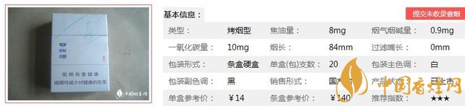 白沙尚品白煙支長84mm,采用國際一流加工設備進行標準化加工,從煙葉生產到卷煙生產全過程進行化學成分分析,確保卷煙成品成分平衡。下面我們一起來看白沙尚品白的參數信息:焦油量:8mg 煙堿量:0.9mg 一氧化碳量:10mg
