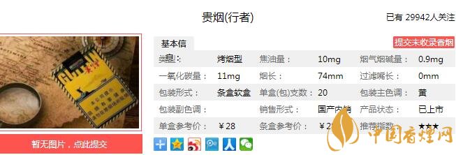 貴煙行者煙支長74mm,過濾嘴長25mm,定位在短支煙品類。自主知識產權的低溫霧化活性礦泉水去雜技術,使煙氣更加干凈與純正,領先的膠囊技術使口感更加津潤舒適。下面我們一起來看貴煙行者的參數信息:焦油量:10mg 煙堿量:0.9mg 一氧化碳量:11mg