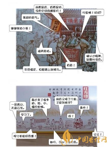 細(xì)看,正面的“前店”是一條古徽州商業(yè)街的圖樣,人頭攢動(dòng)、熙熙攘攘,掛著“露葉頂貢”招牌的紅方印煙莊占據(jù)了C位,門口的“文幫”掌柜手持一片煙葉接受眾人圍觀;背面的“后坊”,則描繪了“武幫”的手工匠人們曬煙、制絲的勞作場景。可惜圖案只能繪色、不能繪聲,假如身臨其境,會(huì)聽到什么樣的聲音呢?惡搞一下吧……