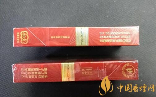 煙盒的左右兩側(cè),金腰帶環(huán)繞在中間,上面還印有黑色的小字英文。左側(cè)還有紅云紅河集團的中英文標示和烤煙型過濾嘴香煙字樣。煙盒的右側(cè)則是這款煙的理化指標:焦油量:9mg,煙氣煙堿量:0.9mg,煙氣一氧化碳量:9mg,還印著珍品香煙字樣。