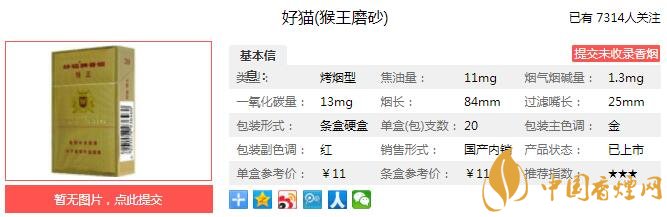 好貓牌香煙(猴王磨砂)”,簡稱“磨砂好貓”。產品的商標保持原猴王包裝裝潢用料和設計特色,配方設計保持“猴王(磨砂)”卷煙產品吸食自然、醇和、明快的香氣特征和吸味風格。經香煙網小編市場調查好貓(猴王磨砂)售價為11元/包。
