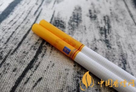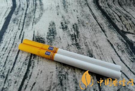 撕掉錫紙,露出的煙支過濾嘴同樣是杏黃色調,相比于細支規格的要重一些。兩排清晰的降焦線,印制于過濾嘴的中間部位。