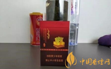盒子的中間,一顆金黃色的玉璽,顯示了它的尊貴的身份,玉璽圖案的右邊是一枚仿古的印章,內有“古都”兩個字,在圖案的下面是好像是一條鑲著寶石的腰帶。煙盒下面三分之一的面積,按照慣例還是警示語標識,警示語為本公司提示版,屬于比較新的一款。